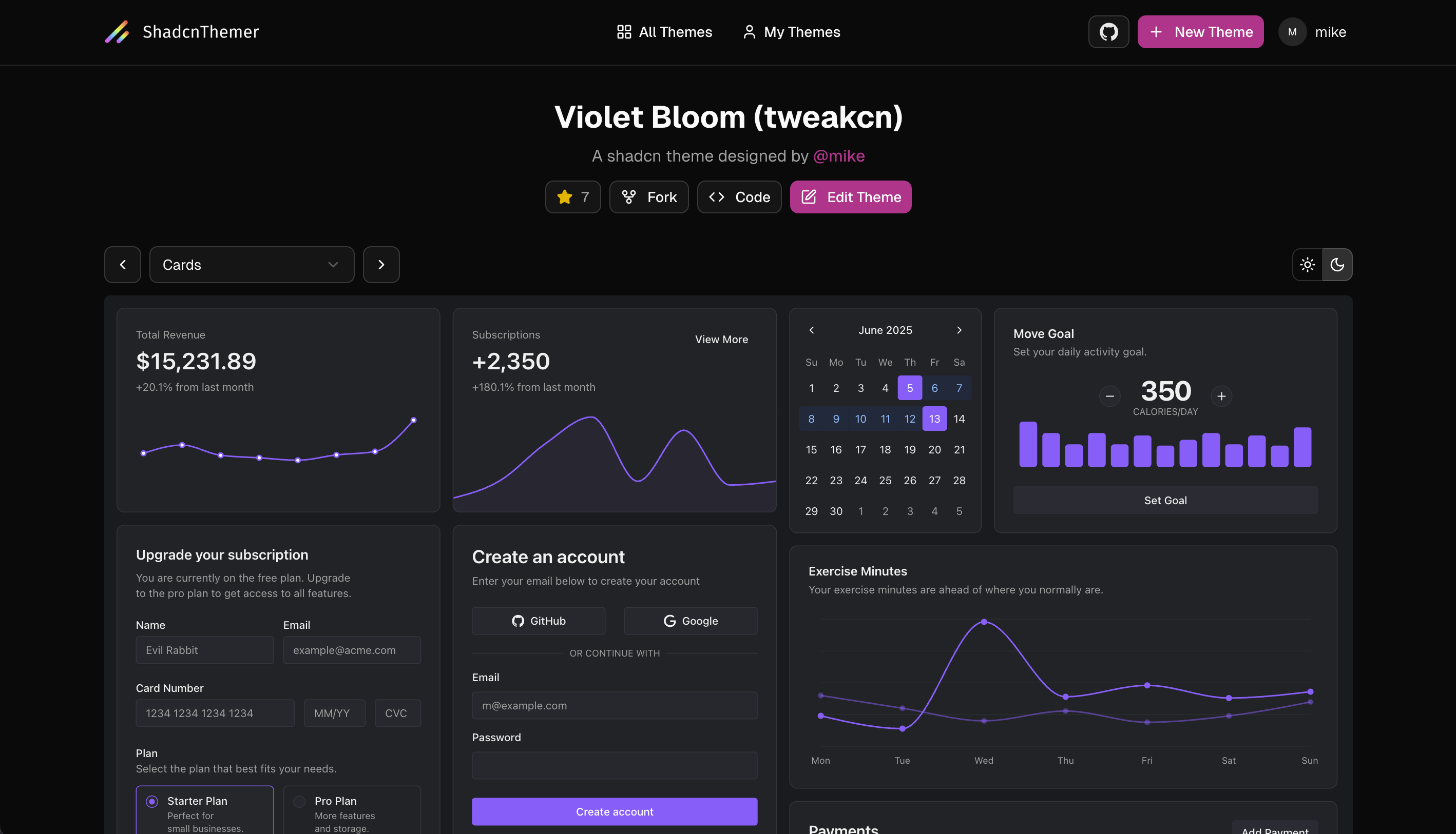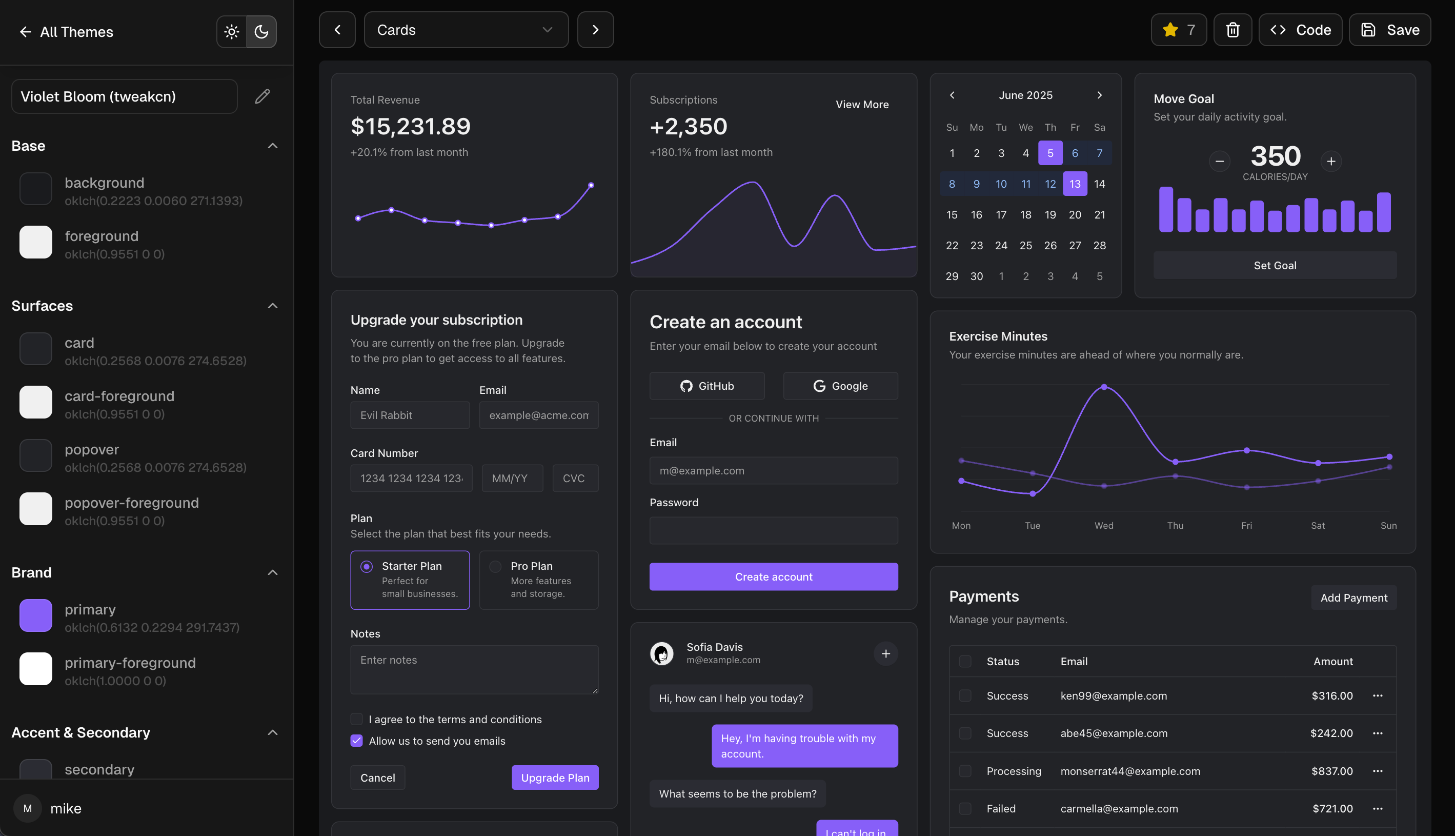 As you tweak values, a live preview updates across example UI components: buttons, cards, forms, dialogs, tables. You see exactly how your theme looks in both light and dark mode simultaneously.