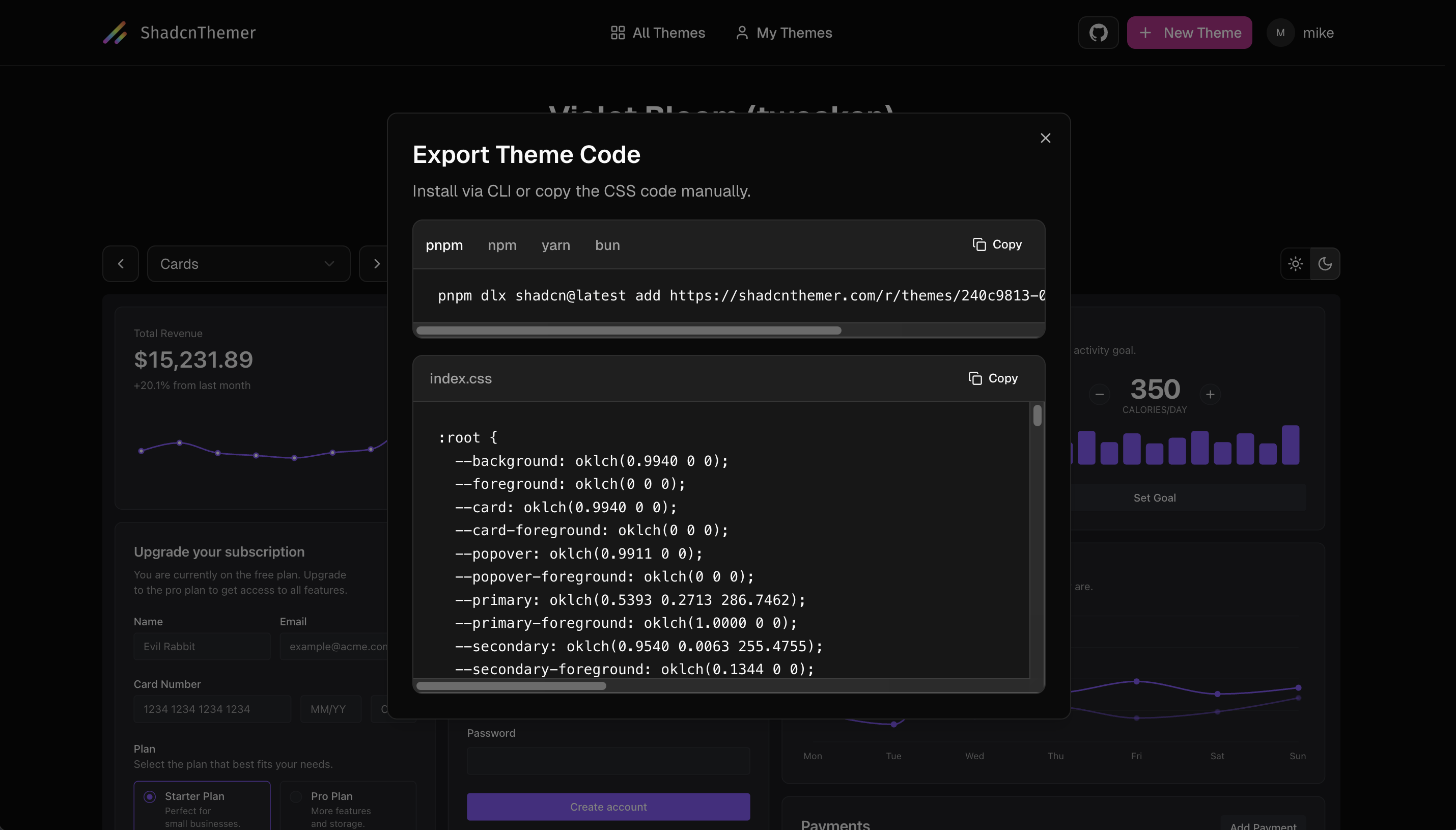 When you're happy with it, export as CSS or use the shadcn CLI registry command to pull it directly into your project.